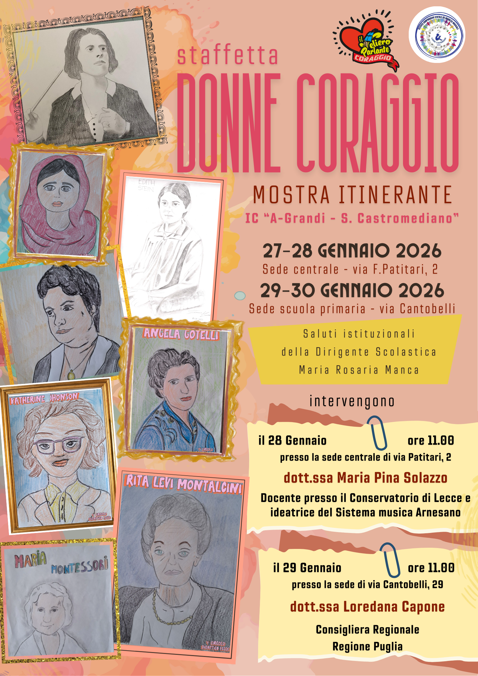 La mostra itinerante “Donne coraggio” , attività promossa dalle rete “Il Veliero Parlante”, fa tappa nella nostra scuola dal 27 al 30 gennaio 2026, i primi due giorni presso la sede centrale di via Patitari, i successivi presso il plesso della scuola primaria in via Cantobelli. Avremo la possibilità di ammirare un percorso espositivo intenso e coinvolgente dedicato a figure femminili che, in epoche e contesti diversi, si sono distinte per impegno, determinazione e amore per la libertà.