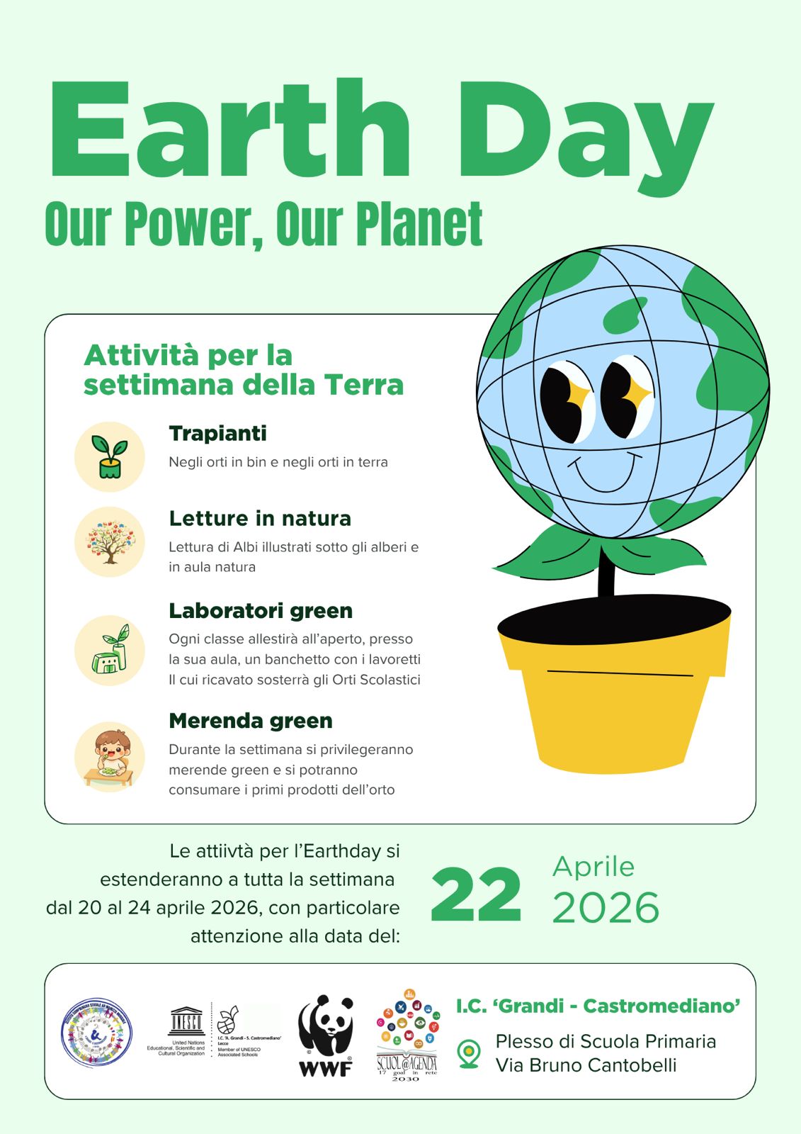 In occasione della Giornata Mondiale della Terra siamo lieti di presentare una settimana ricca di eventi e attività dedicate alla sostenibilità e all’amore per l’ambiente. Le celebrazioni si terranno dal 20 al 24 aprile 2026, con un focus speciale sulla giornata di mercoledì 22 aprile.